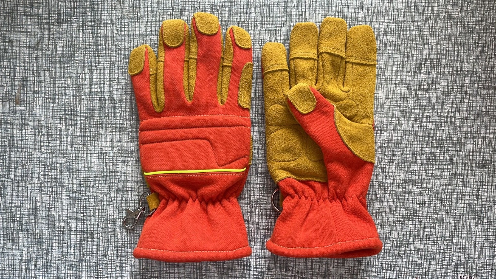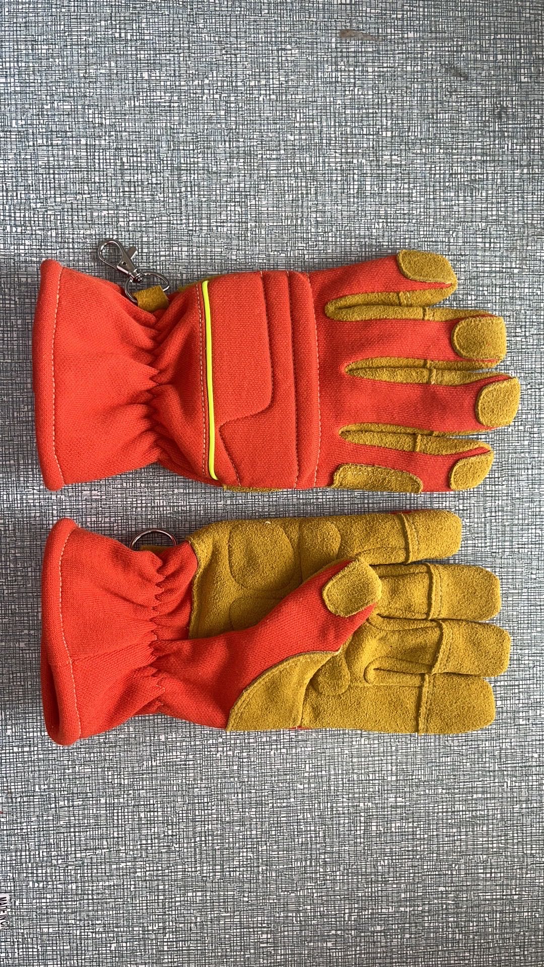 手掌結構為內層為 100%對位芳綸針織布,克重為250克±20克,顏色為黃色。外層用牛皮頭層反絨加強,牛皮厚度為 1.0mm(±0.2mm),顏色為黃色;手背結構為 50%對位芳綸和50%間對位芳綸雙面針織布,克重為 380克±20克。朝外的一面為間位芳綸,顏色為橘紅色,對位芳綸為黃色;手掌、手背整片與插入的圓形內置袖口,外加一條與手背完全一致的材料包邊,縫線到袖口距離10mm±5mm。